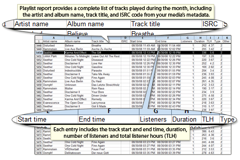 Centova Cast fournit des feuilles de calcul mensuelles téléchargeables contenant la liste complète des chansons que vous avez joué sur votre flux au cours du mois dernier, y compris des informations détaillées sur la date, l'heure et l'audience de chaque performance.